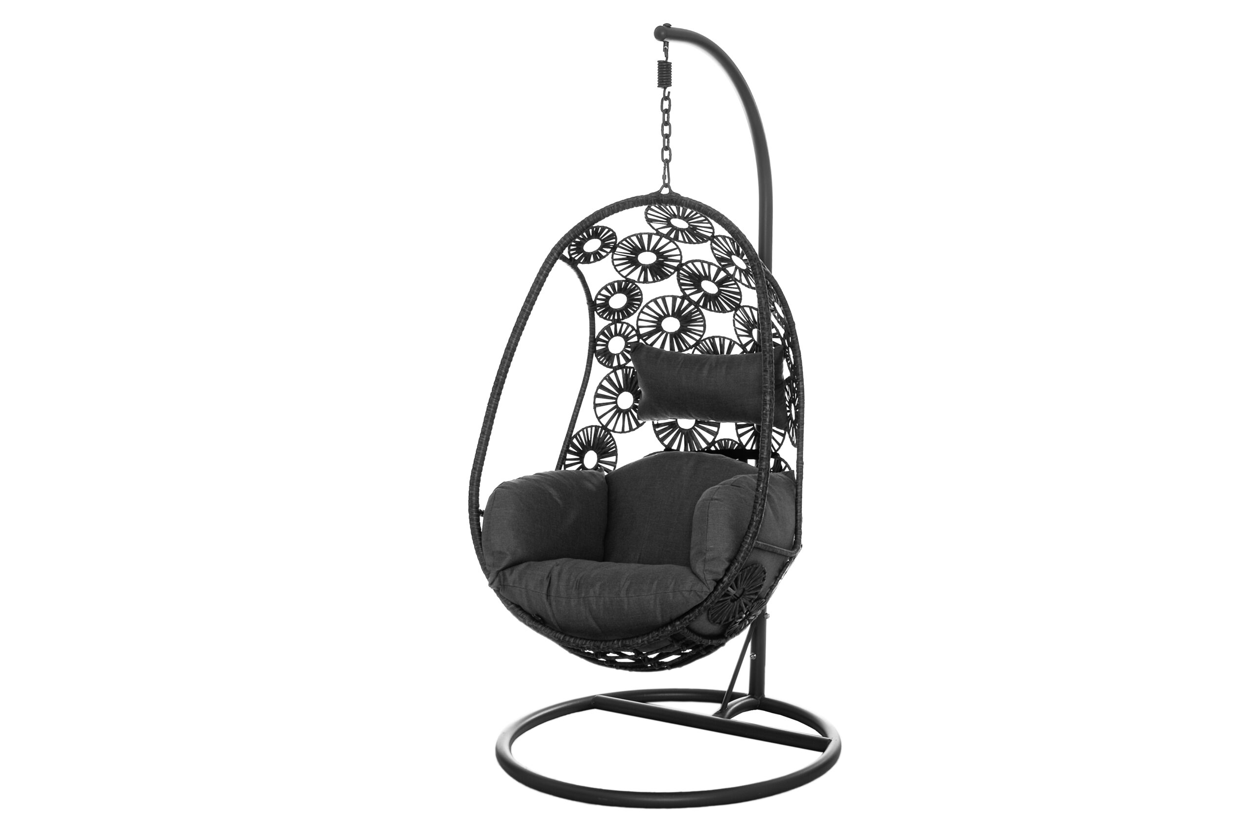 Riipputuoli nyt ihastuttavalla kukkapunoksella. Säänkestävästä polyeteenipunoksesta valmistetussa riipputuolissa on teräksinen jalkaosa.