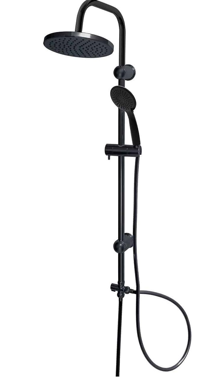 Ylellinen musta suihkupaneeli, jossa kattosuihku ja käsisuihku.