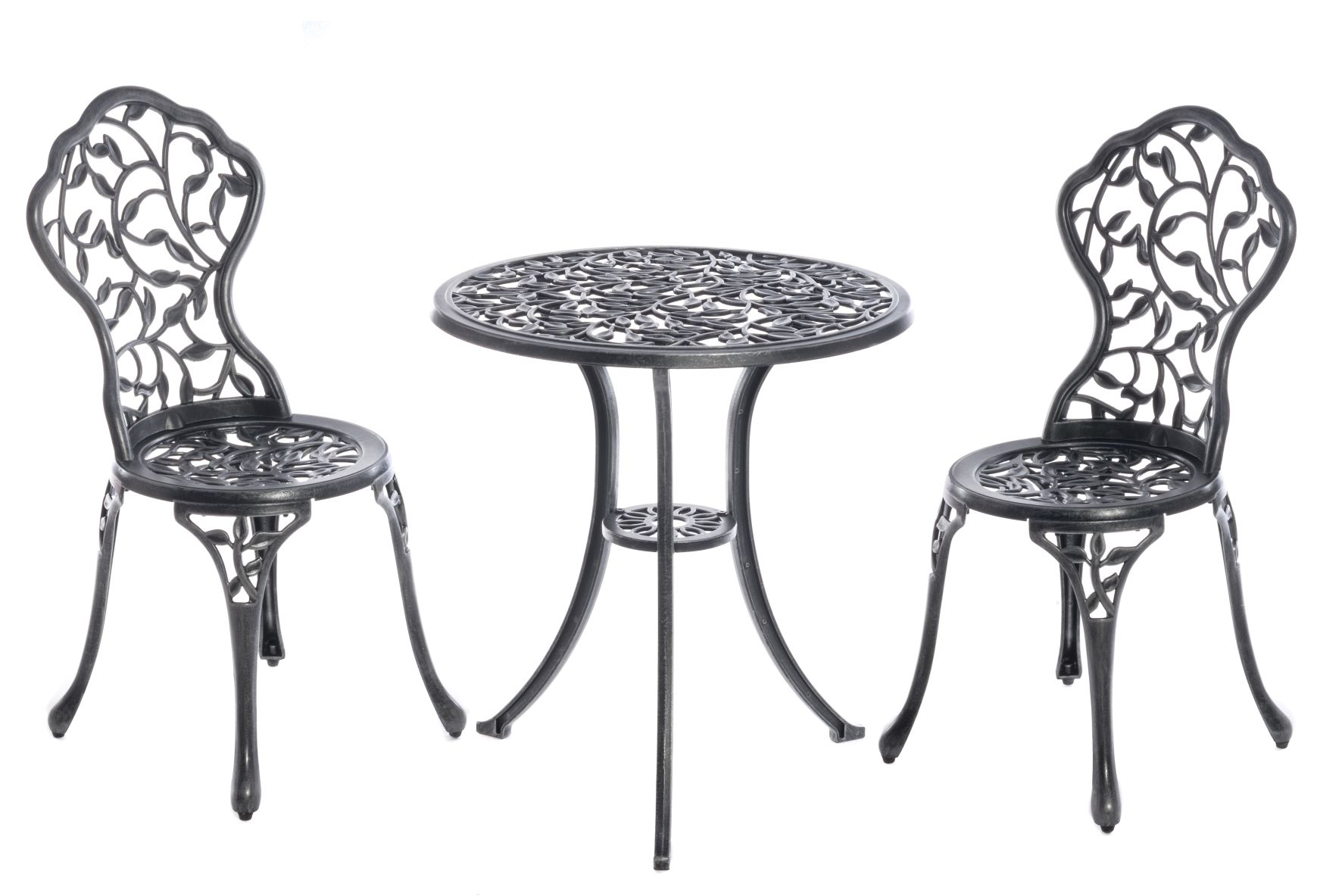 Pöytä ja kaksi tuolia. Pöydän kansi ja tuolien selkänojat valualumiinia, muuten valurautaa.