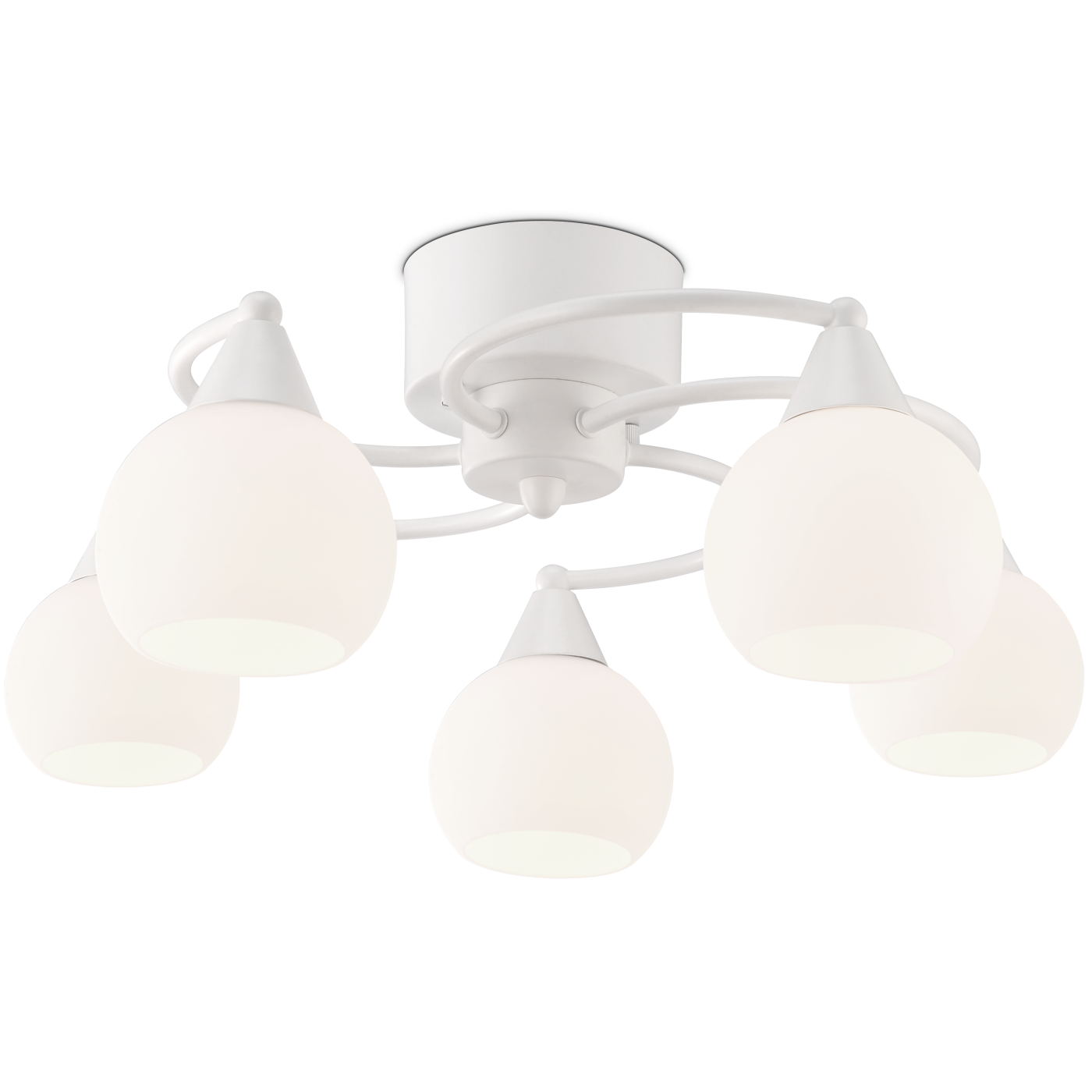 Kaunis viisiosainen Iris-plafondi on aina tyylkäs ja ajaton. Näyttävä mattavalkoinen valaisin on valmistettu metallista ja siinä on lasiset kuvut. Todella helppo asentaa koukkukiinnityksellä, valaisinpistotulppa sisältyy tuotteeseen 5 X E14 / 40W.