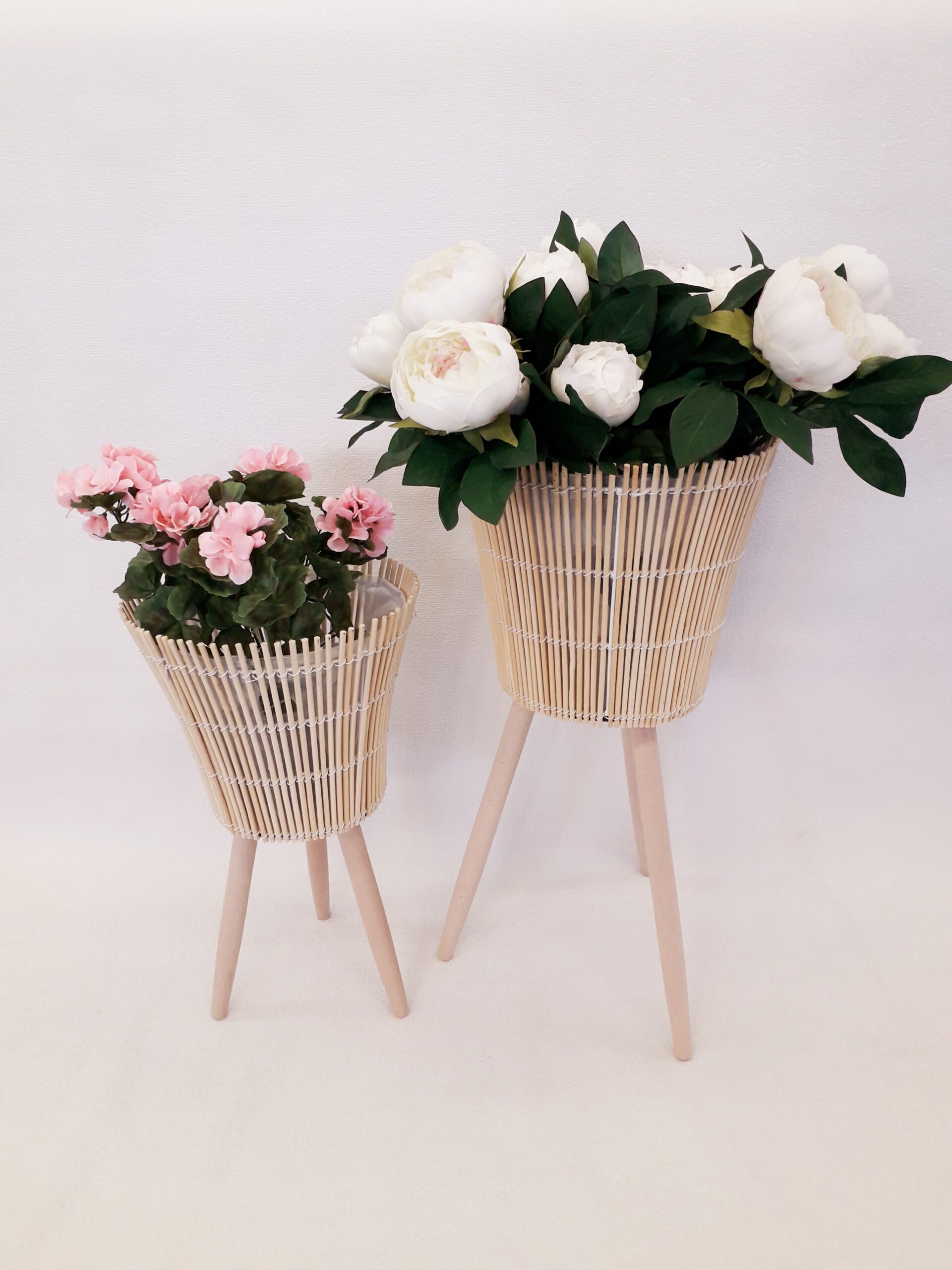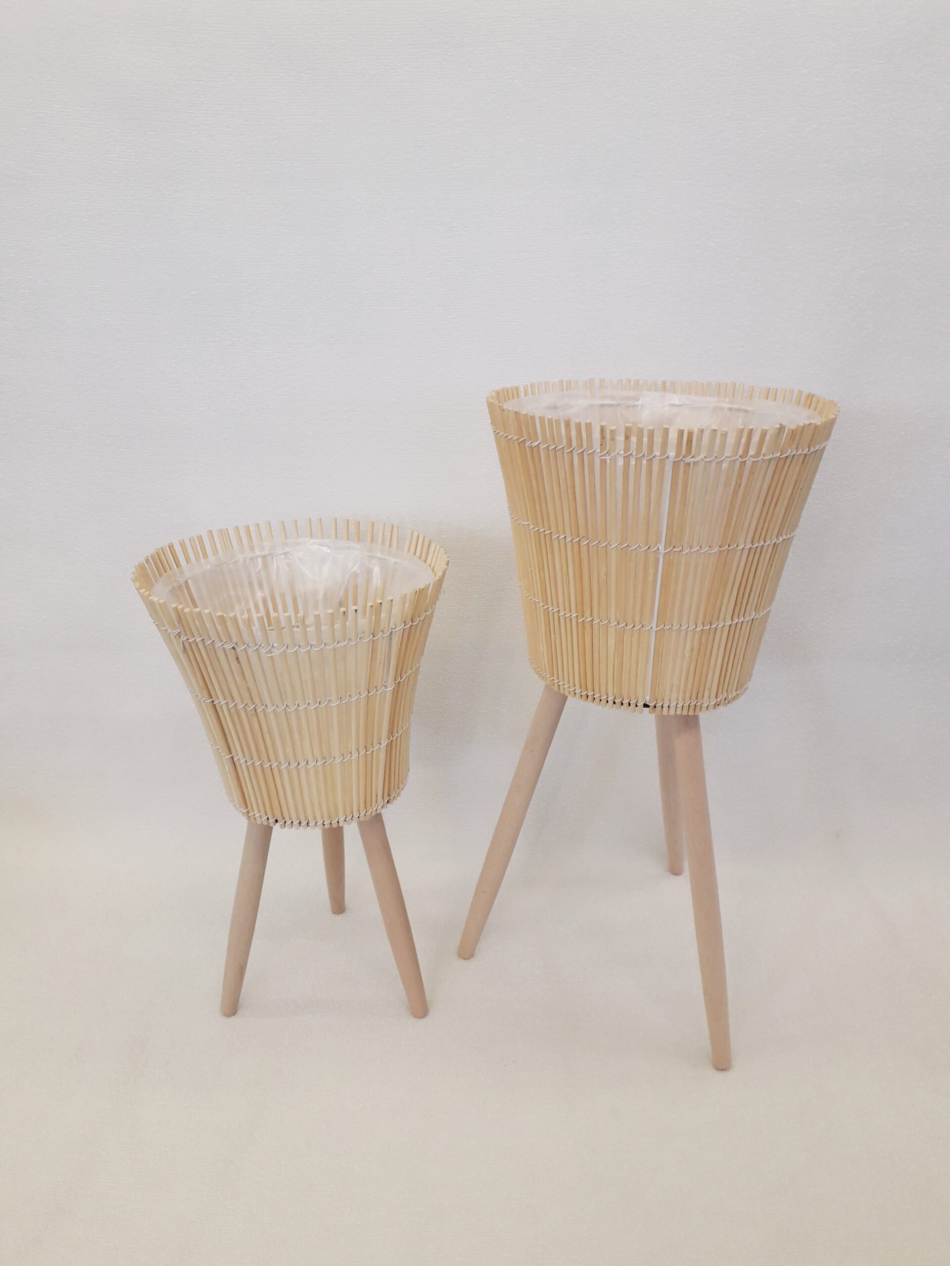 Puinen istutusruukku jaloilla, muovitettu ruukun sisus.