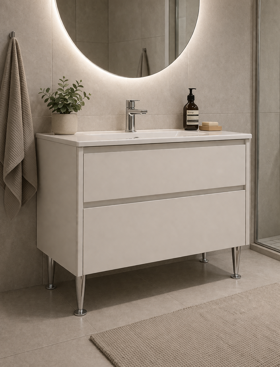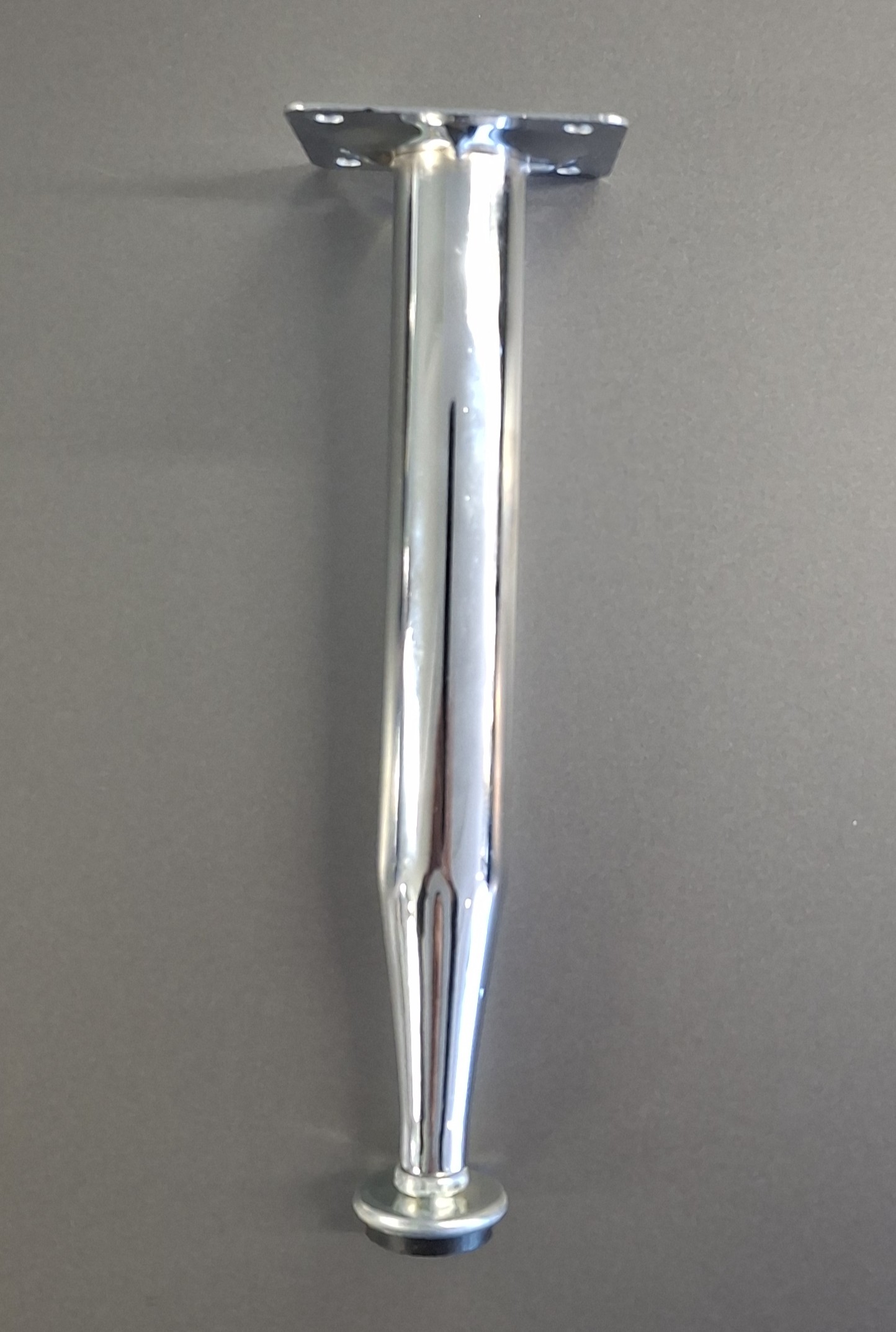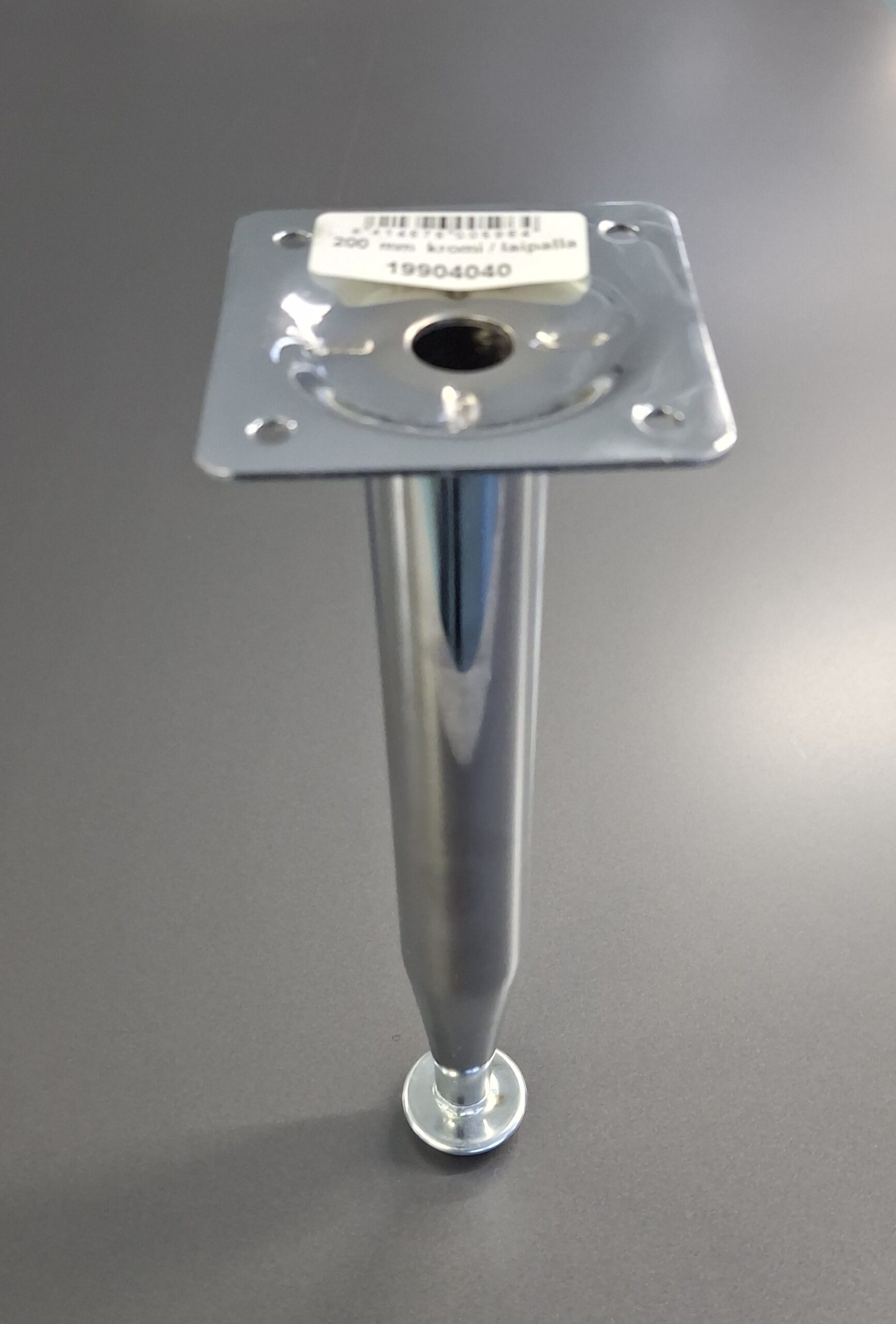 Teräksestä valmistettu putki- / kalustejalka laipalla. Viimeistely kromattu. Jalan pohjassa säätöruuvi, jonka avulla kalusteen saa säädettyä suoraan epätasaisellakin lattialla. Käyttökohteena erilaiset kalusteet, mm. pöydät ja lipastot.