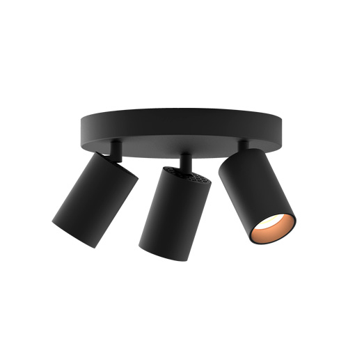 Harjun tyylikäs pysty- ja vaakatasossa suunnattava 3-osainen musta PRIMUS spottivalaisin sisäkäyttöön. Pinta-asennus kattoon jakorasiaan.