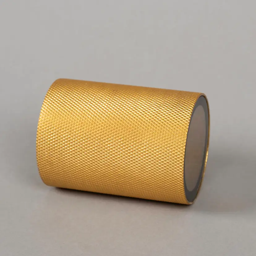 Tyylikäs Temi kullanväriseksi lakattua alumiinia ja kirkasta lasia.