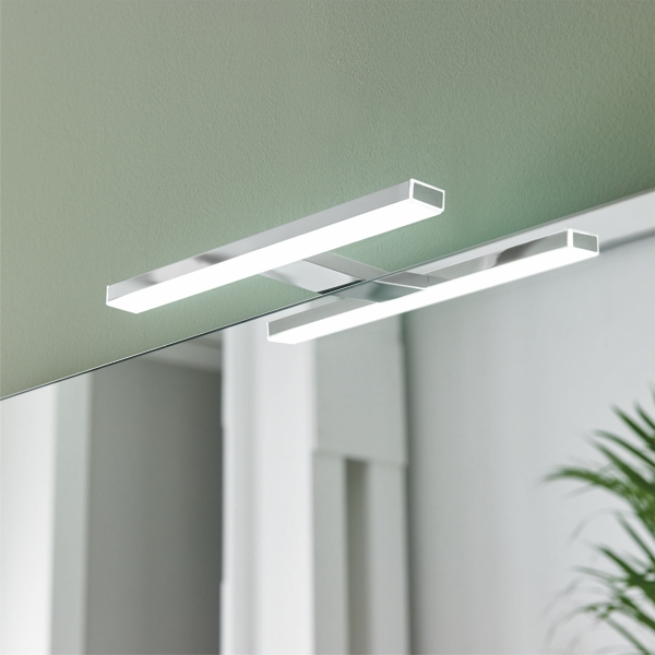 valaisin, jonka mukana toimitetaan uusi kiinnitin kaapin päälle asennusta helpottamaan. Kiinnitettävissä myös peilin taakse. Irrottamalla uuden kiinnittimen osat toisistaan voi valaisimen kiinnittää myös max. 6mm peiliin. IP44, 6W, 457 lumenia, 4000K. CRI > 80,
