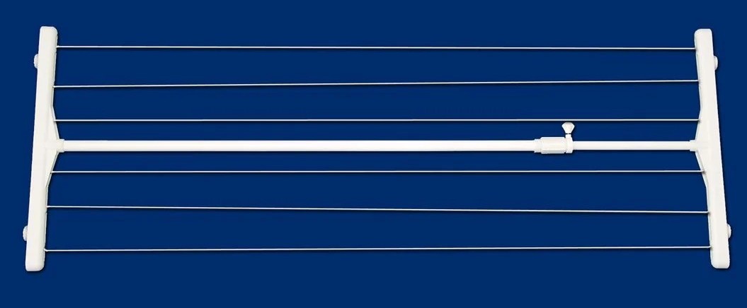 Teräsrunkoisessa, valkoiseksi maalatussa kuivaustelineessä on kuusi pyykkinarua Kuivausteline pingotetaan seinästä seinään ja kiristetään siipiruuvin avulla, joten asentamiseen ei tarvita työkaluja.