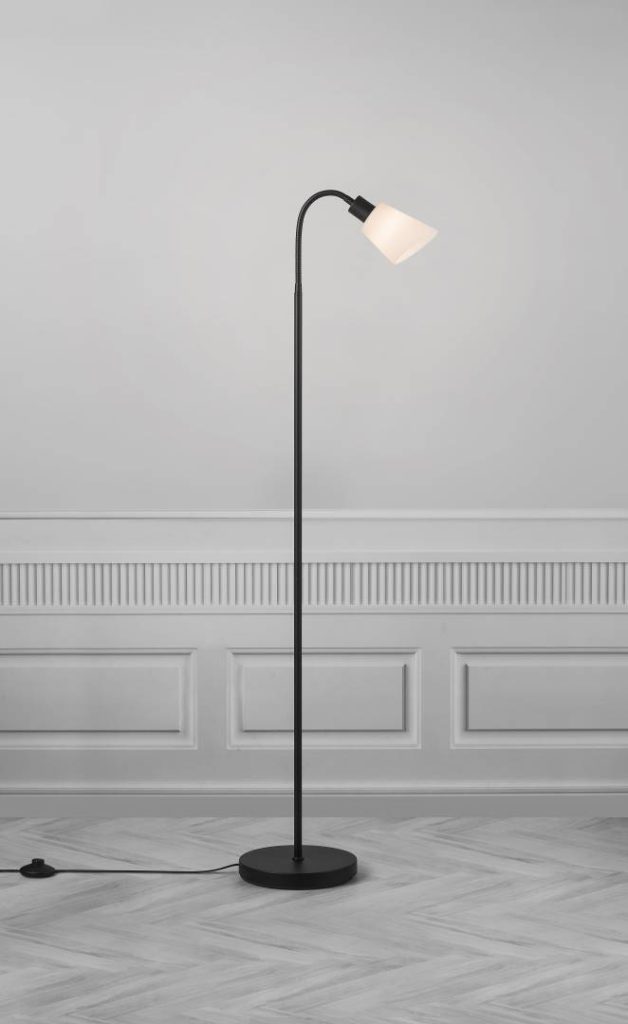 Ajattoman mallinen kaunis lattiavalaisin mustaa metallia ja opaalivalkoista lasia.