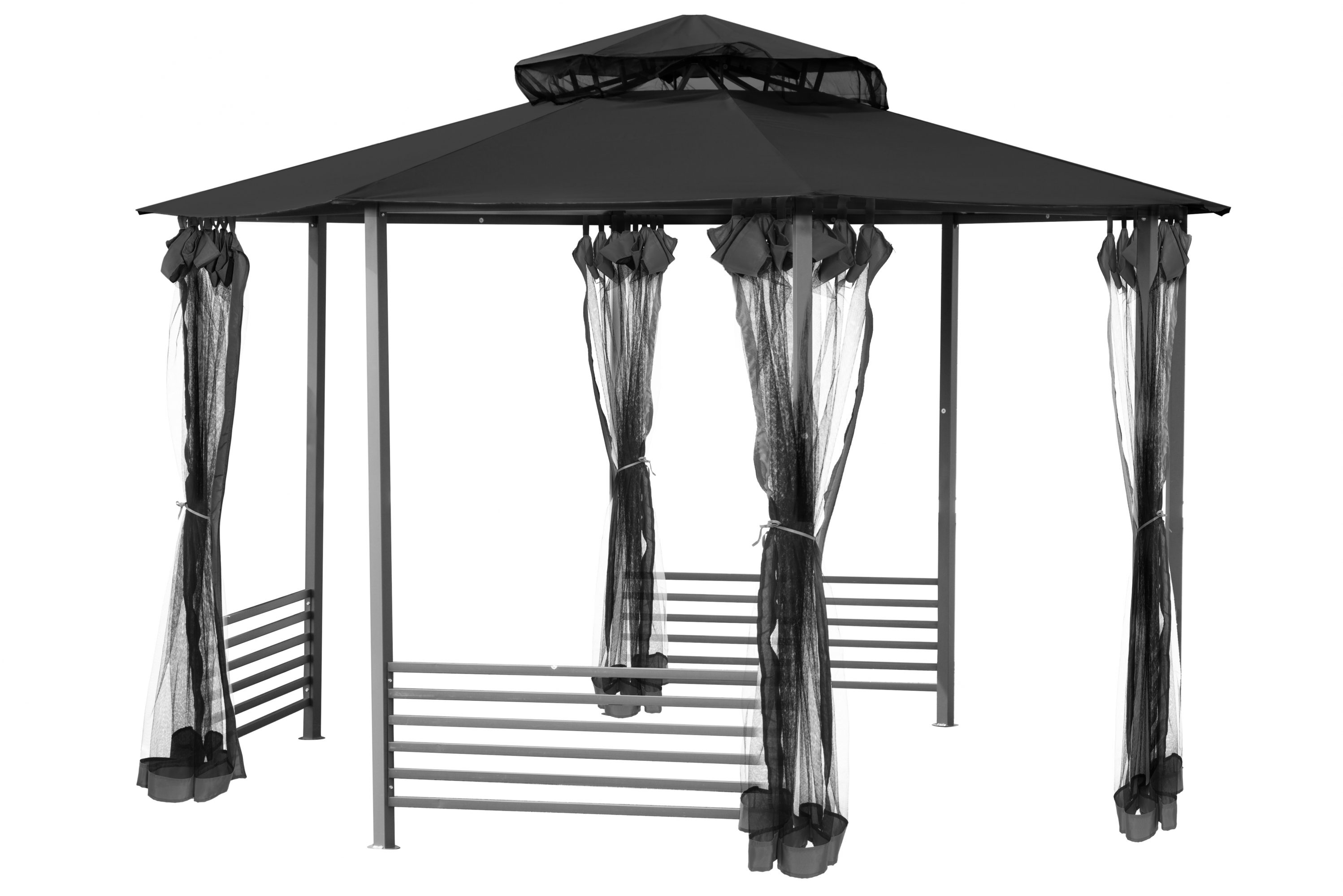 Sateenpitävä, teräsrunkoinen paviljonki mustilla hyttysverkoilla. Kate UV-suojattua ja PVC-pinnoitettua 300g/m2 polyesteriä, katteessa vesireiät 1kpl/lape. 8-ruoteinen kattorakenne 15 x 30 mm ja 20 x 20 mm, seinämävahvuus 0,5 mm. Pystytolpat 50 x 50 mm, sivuaidat 15 x 30 mm.