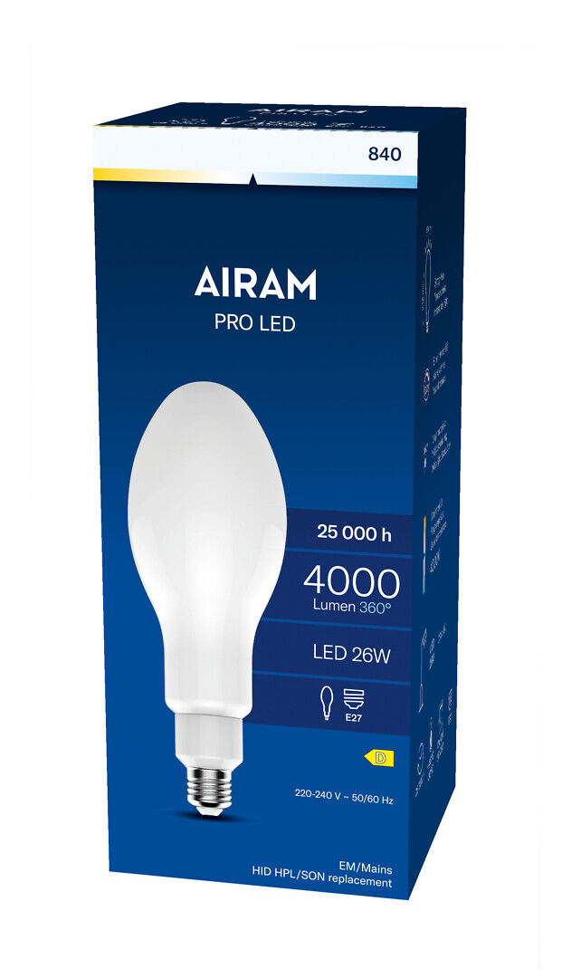 Airamin Pro led -malliston uudet high power ledit korvaavat perinteiset purkauslamput. Led-versioon vaihtamalla voit paitsi suojella ympäristöä välttämällä elohopeaa ja muita myrkyllisiä materiaaleja sisältävien lamppujen käyttöä, myös säästää jopa 75 % energiaa. Lampun ellipsinmuotoinen opaalikupu valaisee tasaisesti ja energiatehokkaasti
