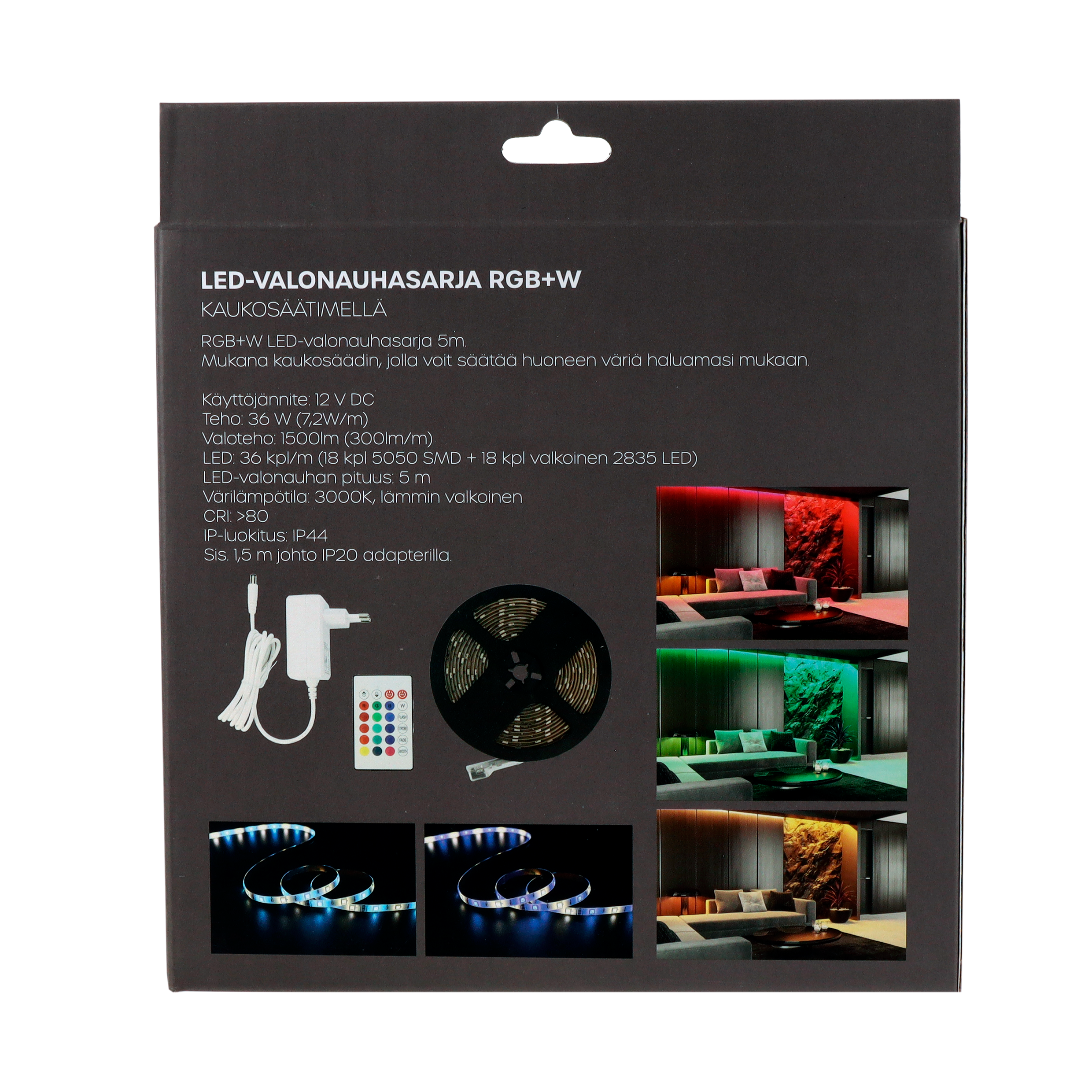 LED Energie RGB+W LED-valonauhasarjan värivaloilla luot tyylikästä tunnelmaa tai valaiset huoneen perinteisellä valkoisella valolla. 5 metrin pituinen sarja tarjoaa monipuolisen valaistusratkaisun, jonka voit säätää helposti kaukosäätimellä haluamasi väriseksi. Valittavissa on punainen, vihreä, sininen sekä niiden eri yhdistelmät. Lisäksi tarjolla on puhdas valkoinen valo. Mukana tulevat kiinnikkeet ja pitkä liitosjohto tekevät asennuksesta vaivatonta. LED nauhaa voi lyhentää leikkaamalla mukana tulevien ohjeiden mukaan. LED nauha soveltuu erinomaisesti sisustukseen, juhlatilaisuuksiin ja tunnelman luomiseen eri tiloissa. Teho 36W Valoteho 1500lm LED 36kpl/m: 18 kpl 5050 SMD+18 kpl valkoinen 2835 LED. Liitosjohto 1,5m IP20 adapterilla Nauha IP44 Pakkauksessa 10 kpl nauhan kiinnikkeitä Energiatehokkuusluokka F Käyttöjännite 12 V DC